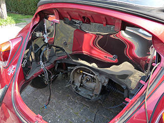 Motorraum ausgebaut. Dahinter alles in Ordnung, ein Grund zur Freude! Bloß die Pappen sind echt schäbig und im Zerfall