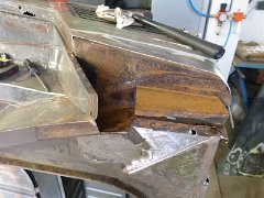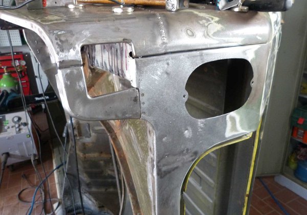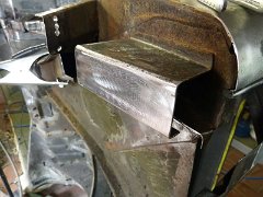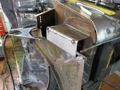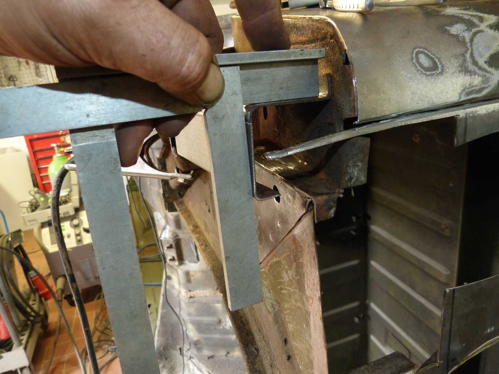 Das Außenblech wird direkt an der Verstärkung angepaßt. Die Abkantung ist eine kleine Änderung des Originals, das geht eigentlich gerade durch. Damit ich nicht…