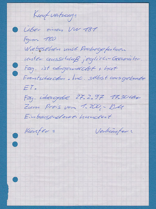 Damit fing alles an. Der klassische Kaufvertrag auf dem DIN A5-Schmierzettel .