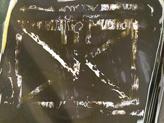 Die Haube ligt auf der Werkbank und ich habe mal vorsichtig geschliffen. Tatsache, es ist ein deutliches